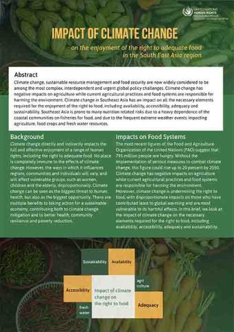 Climate change, sustainable resource management and food security are now widely considered to be among the most complex, interdependent and urgent global policy challenges. Climate change has negative impacts on agriculture while current agricultural practices and food systems are responsible for harming the environment. Climate change in Southeast Asia has an impact on all the necessary elements required for the enjoyment of the right to food, including availability, accessibility, adequacy and sustainability. Southeast Asia is prone to many nutrition related risks due to a heavy dependence of the coastal communities on fisheries for food, and due to the frequent extreme weather events impacting agriculture, food crops and fresh water resources.