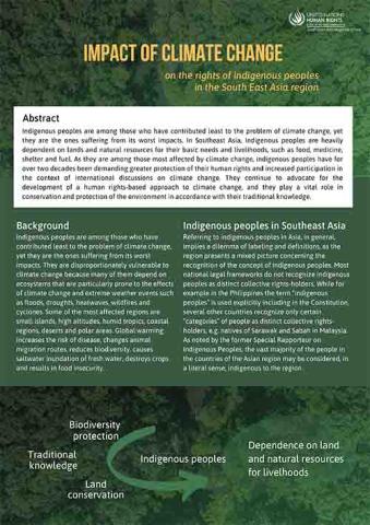 Indigenous peoples are among those who have contributed least to the problem of climate change, yet they are the ones suffering from its worst impacts. In Southeast Asia, Indigenous peoples are heavily dependent on lands and natural resources for their basic needs and livelihoods, such as food, medicine, shelter and fuel. As they are among those most affected by climate change, indigenous peoples have for over two decades been demanding greater protection of their human rights and increased participation in the context of international discussions on climate change. They continue to advocate for the development of a human rights-based approach to climate change, and they play a vital role in conservation and protection of the environment in accordance with their traditional knowledge.