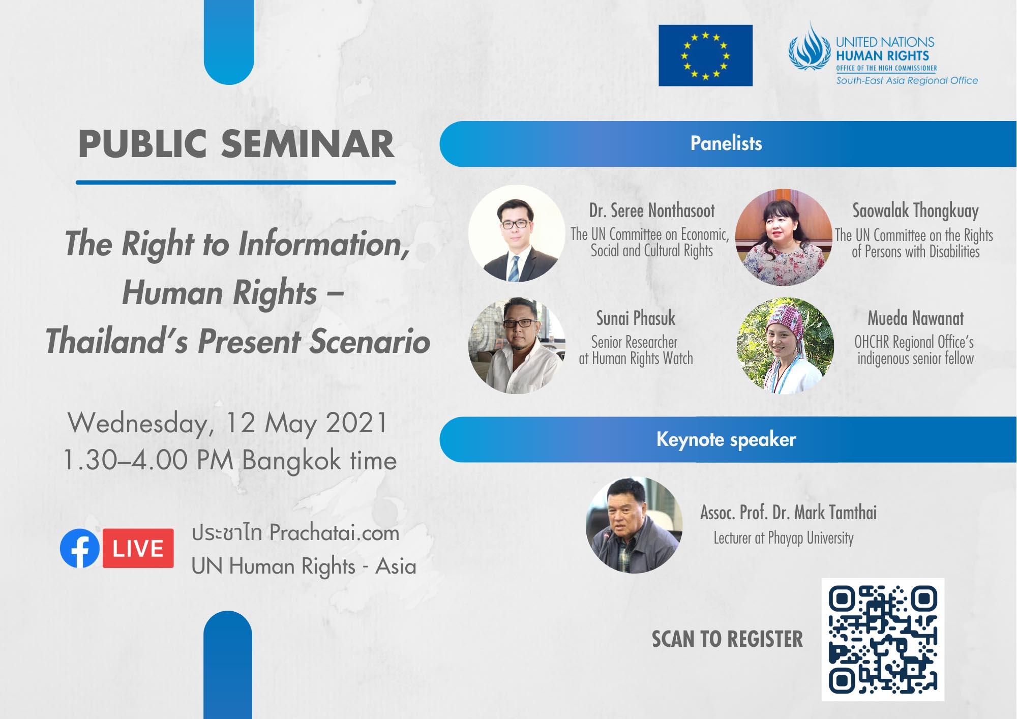 The UN Human Rights Office for South-East Asia is holding a virtual public webinar: “The Right to Information, Human Rights – Thailand’s Present Scenario” with the support the European Union. Register today to hear an insightful conversation from our speakers to learn about the importance of the right to information in a democratic society and the present situation of the right to information in Thailand.
