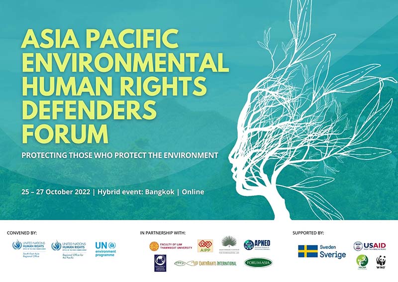 The event is jointly organized by United Nations Office of the High Commissioner for Human Rights (OHCHR) Regional Offices for South-East Asia and the Pacific; United Nations Environment Programme (UNEP) Regional Office for Asia and the Pacific; Faculty of Law, Thammasat University in Thailand; Asia Indigenous Peoples Pact (AIPP); Asian Research Institute for Environmental Law (ARIEL), Asia Pacific Network of Environmental Defenders (APNED); Diplomacy Training Program (DTP); EarthRights International; and FORUM-Asia. The forum will be held both online and in-person in English language.
