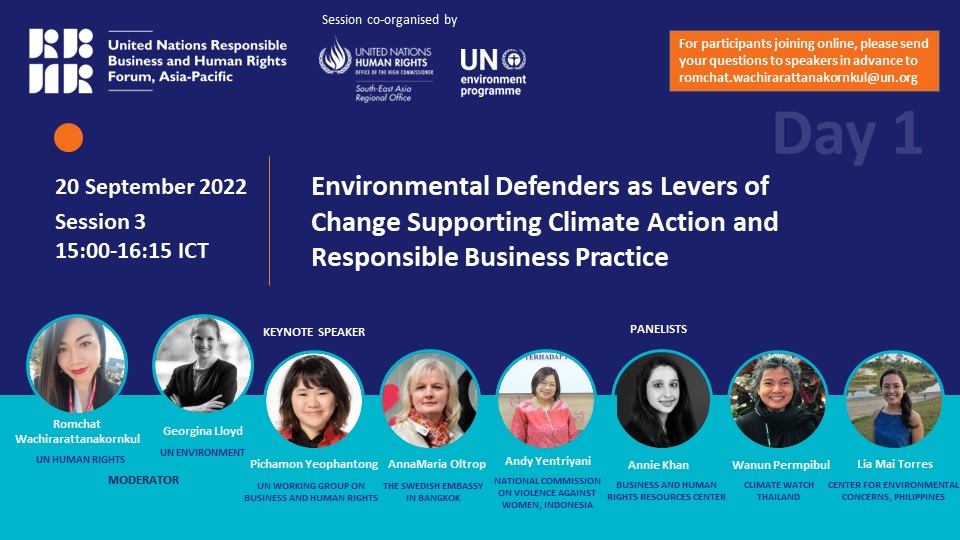 This year, the UN Human Rights Office is leading the organisation of two sessions and is co-organising one session with the UN Environment Programme in Asia Pacific. More details of each session can be found below: