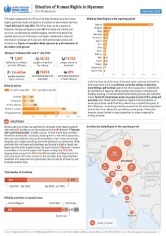 Prepared pursuant to Human Rights Council resolution 52/31, this report presents findings based on OHCHR monitoring and verification of the overall situation of human rights in Myanmar regarding alleged violations of international human rights law and international humanitarian law, as well as the rule of law, since 1 April 2023. It concludes by examining the impact of the crisis on the mental health of the population and good practices in provision of mental health services by civil society and community-based organizations. The report concludes with recommendations to the military, armed groups and international community, including to ensure accountability.