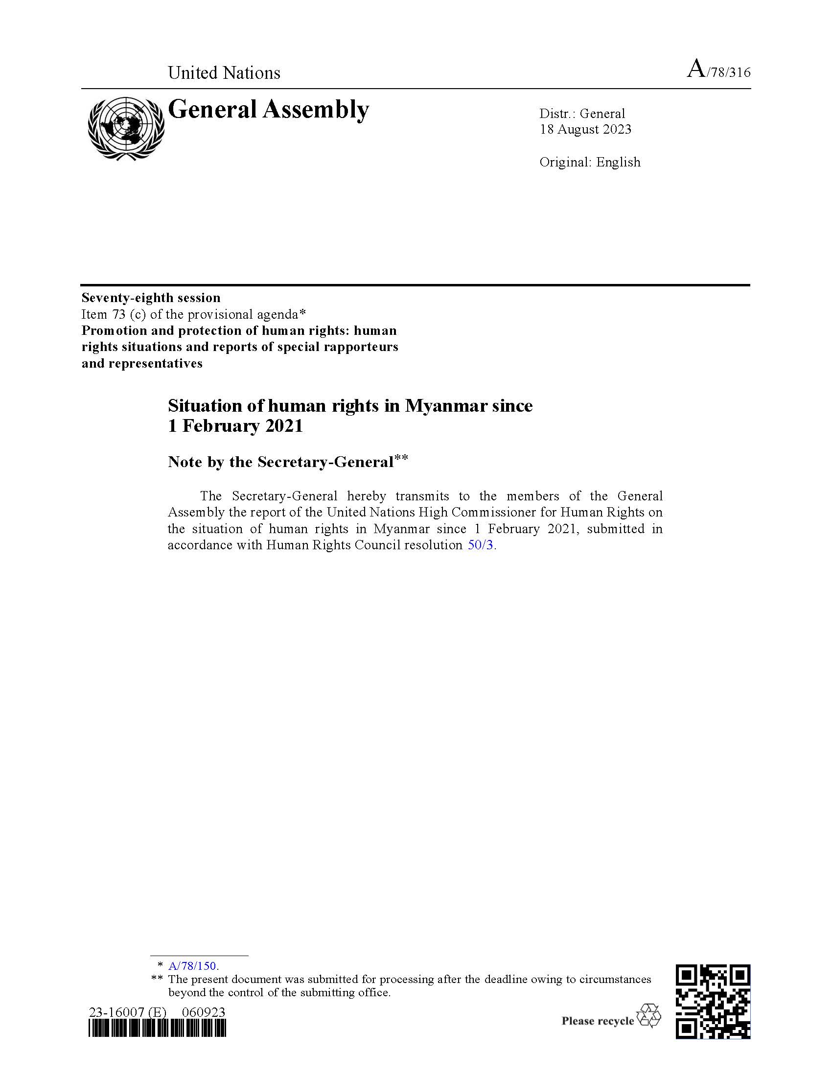 The present report is submitted pursuant to Human Rights Council resolution 50/3, in which the Council requested the United Nations High Commissioner for Human Rights to report on the human rights situation in Myanmar at the seventy eighth session of the General Assembly. The report serves to identify trends and patterns of human rights violations in Myanmar between 1 February 2021 and 30 April 2023, with a focus on the human rights impacts as a result of the denial of humanitarian access. The present comprehensive documentation is further supplemented by data on the situation of human rights and humanitarian access in Rakhine State after Cyclone Mocha in May 2023