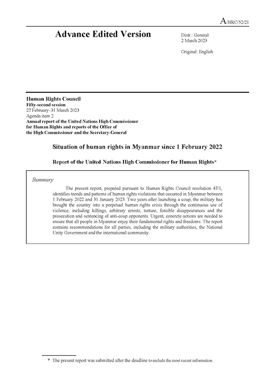 Prepared pursuant to Human Rights Council resolution 47/1, this report identifies trends and patterns of human rights violations that occurred in Myanmar between 1 February 2022 and 31 January 2023. Two years after launching a coup, the military has brought the country into a perpetual human rights crisis through continuous use of violence, including killing, arbitrarily arresting, torturing, forcibly disappearing, prosecuting, and sentencing anti-coup opponents. Urgent, concrete actions are needed to ensure that all people in Myanmar enjoy their fundamental rights and freedoms. Recommendations are made to all parties, including military authorities, the ‘National Unity Government’, and the international community.