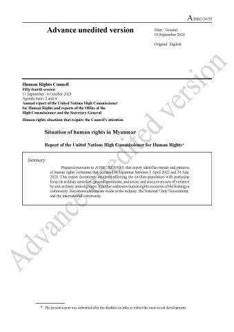 Prepared pursuant to A/HRC/RES/50/3, this report identifies trends and patterns of human rights violations that occurred in Myanmar between 1 April 2022 and 31 July 2023. This report documents incidents affecting the civilian population with particular focus on military airstrikes, ground operations, and arson, and also covers acts of violence by anti-military armed groups. It further addresses human rights concerns of the Rohingya community. Recommendations are made to the military, the National Unity Government, and the international community.