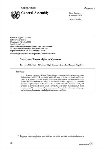 Prepared pursuant to Human Rights Council resolution 52/31, this report presents findings based on OHCHR monitoring and verification of the overall situation of human rights in Myanmar regarding alleged violations of international human rights law and international humanitarian law, as well as the rule of law, since 1 April 2023. It concludes by examining the impact of the crisis on the mental health of the population and good practices in provision of mental health services by civil society and community-based organizations. The report concludes with recommendations to the military, armed groups and international community, including to ensure accountability.